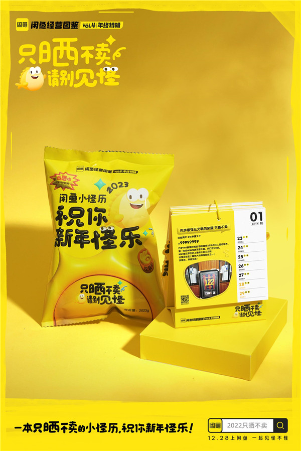 闲鱼官方也敏锐地洞察到这一点,在2022年末推出了闲鱼经营图鉴系列活动的年度特辑——【只晒不卖,请别见怪!】把这年来闲鱼上的年轻人晒出的千奇百怪的好物,集中呈现给广大用户;并精挑细选了52件宝贝,制作成活动限定款年历——「闲鱼小怪历」在本次活动中作为用户互动奖品,“只晒不卖”。