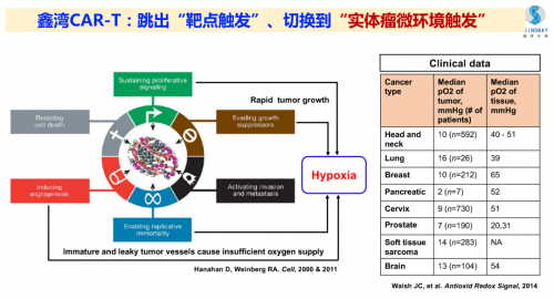 首先,为了解决实体瘤缺少特异性靶标的问题,鑫湾生物最早在研发中,在传统的靶点触发杀伤的基础上增加了一把“分子安全锁”, 就是靶点在激活之前,只能在缺氧环境下才能被激活杀伤,因此也叫乏氧激活 ,能够保证免疫细胞在正常组织中不激活,在肿瘤环境中才能激活,从而避免了交叉靶标可能引发的药物安全性问题。