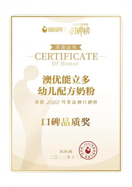 口碑品质奖是根据本年度品牌用户产出的试用报告/口碑内容量,在综合全民投票数进行加权评分后评定。澳优能立多幼儿配方奶粉获得口碑品质奖,实证其品质与口碑兼备,深受用户信赖。