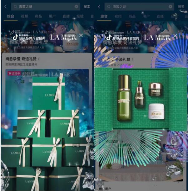 “C”指营销活动。本次活动以“绮愈挚爱 奇迹礼赞”为传播主题,礼盒元素贯穿始终。我们发现,品牌邀请了30多位美妆护肤类KOL,以把“奇迹”送给挚爱为主题,打造礼盒开箱视频内容,为节日季预热蓄势。优质的种草内容,刺激用户“主动搜”。达人评论区置顶关键词引导“看后搜”,则有效提升了搜索效率。搜索跳转直播间、商品卡,也有效承接了种草带来的流量,活动期搜索GMV环比提升500%。活动还发起节日挑战,联动多位颜值类达人打造节日大片。此外,创意视频发布当天,站内上线了搜索彩蛋资源。用户抖音搜“海蓝之谜”,即可触发“开启礼盒”的视频彩蛋。在笔者看来,彩蛋直观强化了品牌开业和节日氛围,也给用户带来视觉上的惊喜。