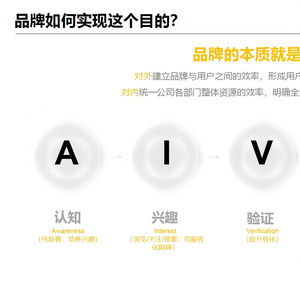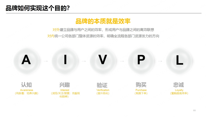 那么品牌如何实现这一目的呢?品牌的本质就是做效率,对外建立品牌与用户之间的效率,形成用户与品牌之间的高效联想,对内统一公司各部门整体资源的效率,明确全流程各部门资源发力的方向。围绕这一本质,从A(认知)I(兴趣)V(验证)P(购买)L(忠诚)整个用户消费旅程进行拆解,品牌、市场、渠道、产品在不同阶段承担着各自的关键任务,通过整个流程的梳理,可以帮助大家更好的理解做品牌市场工作的目标,解决为什么的问题。