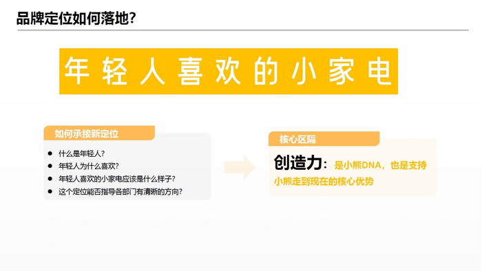 最终我们完成了在“年轻人喜欢的小家电”这个大一品牌定位下,以“创造力”为品牌基因,对目标人群、品牌主张、价值占位、产品卖点、用户场景等核心信息的层层拆解和细化,由内自外,对产品研发、渠道拓展、用户沟通都起到了方向指导的作用。