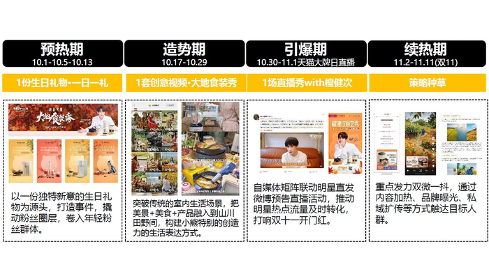 再分享一个小熊电器逆势增长的营销案例。今年双十一,小熊电器通过一场“大地食装秀”连接年轻消费者,以代言人生日为出发点,全面深化内容营销玩法。用12组秋色可餐的创意视频,占领中高端年轻消费者心智,鼓励年轻人解锁创造力生活;同时借助代言人势能将热度引流至电商,开启天猫开门红直播制造销售爆点,为双十一强力蓄水,最终实现声量销量双升,全渠道销售额同比增长40%的佳绩。