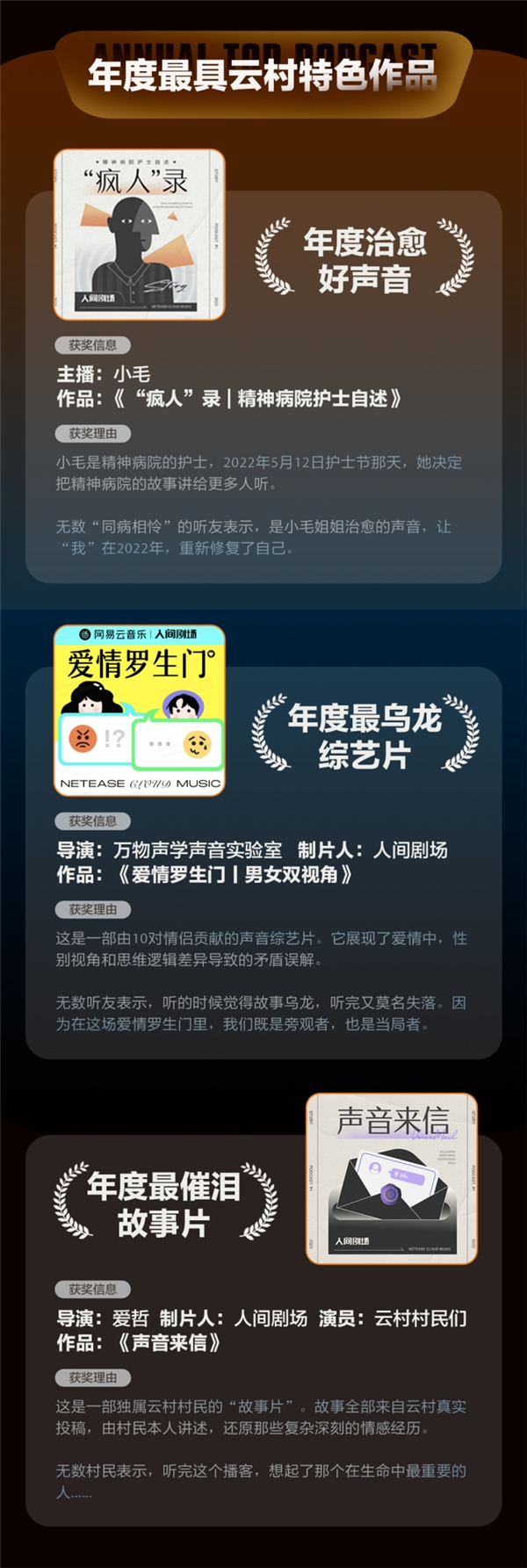年度最具云村特色部分致力于深挖特色化、创新化等声音内容。网易云音乐人间剧场独家出品的播客《疯人录》成为“年度最治愈好声音”,近5万人订阅收藏,超过200万网友收听,获得9.8分的“高分必听”tittle,该播客还被改编成同名广播剧《疯人录》,用更新颖的形式呼吁人们关注并了解抑郁症。由10对情侣贡献的全网首档精品“声音爱情综艺”《爱情罗生门丨男女双视角》成为“年度最乌龙综艺片”,展现了爱情中性别视角和思维逻辑差异导致的矛盾误解。更有独属云村村民的《声音来信》成为“年度最催泪的故事片”,故事全部来自云村真实投稿,由村民本人讲述,还原那些复杂深刻的情感经历。