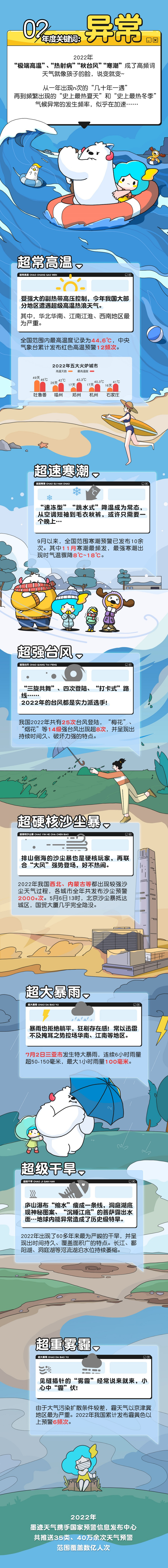 2022年,“极端高温”、“热射病”“秋台风”“寒潮”成了高频词,天气就像孩子的脸,说变就变。从一年出现n次的“几十年一遇”,再到频繁出现的“史上最热夏天”和“史上最热冬季”,气候异常的发生频率,似乎在加速……数据显示,2022年墨迹天气携手国家预警信息发布中心共推送35类、40万余次天气预警,范围覆盖数亿人次。其中最为严重的异常气象有:超常高温、超速寒潮、超强台风、超硬核沙尘暴、超大暴雨、超级干旱、超重雾霾等。