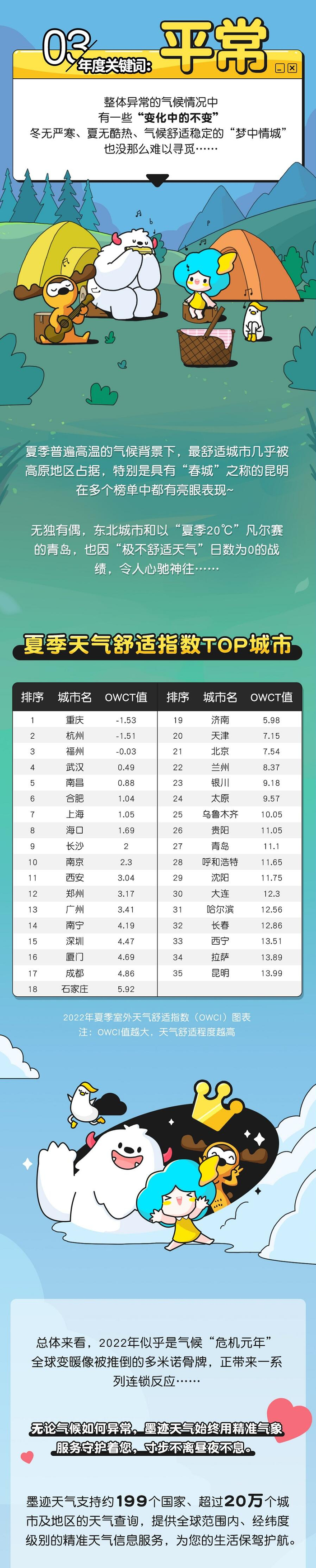 整体异常的气候情况中,也有一些“变化中的不变”。冬无严寒、夏无酷热、气候舒适稳定的“梦中情城”,其实没那么难以寻觅。以2022年夏季室外天气舒适指数(OWCI)TOP城市为例,OWCI≥9的城市有13个(注:OWCI≥9为舒适,OWCI值越大,天气舒适程度越高),它们主要分布在高原地区,分别是:银川、太原、乌鲁木齐、贵阳、青岛、呼和浩特、沈阳、大连、哈尔滨、长春、西宁、拉萨、昆明,其中昆明更是以OWCI=13.99的优秀表现位居榜首。