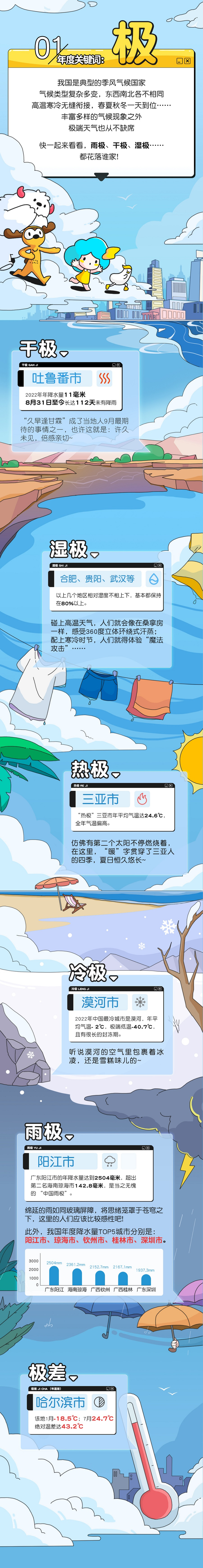 墨迹天气气象数据显示,2022年我国干极为位于西北内陆地区的吐鲁番市,该地年降水量仅11毫米,8月31日至今长达112天未下雨。相比于极致的干,武汉、合肥、贵阳等城市则极“湿”,几个地区相对湿度基本都保持在80%以上。此外,2022年最能下雨的城市前五名都在南方,它们是:广东阳江市、海南琼海市、广西钦州市、广西桂林市、广东深圳市。其中,位列第一名的阳江市降水量达到2504毫米,而琼海市、钦州市、桂林市年降雨量也均超过2000毫米。