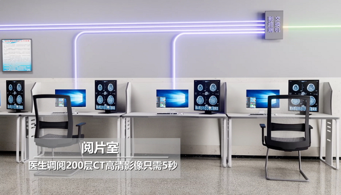 以CT、PET等为代表的医疗影像设备单次扫描便能生成数个GB的数据,传统网络需要大量时间才能完成数据上传。而智融全光2.0解决方案则能充分发挥高带宽优势,极大缩短数据上传时间,加速医院运行效率。影终端所提供的多个网络接口则能在满足CT机联网需求的同时为多台控制PC及其他设备提供网络连接,简化网络架构。