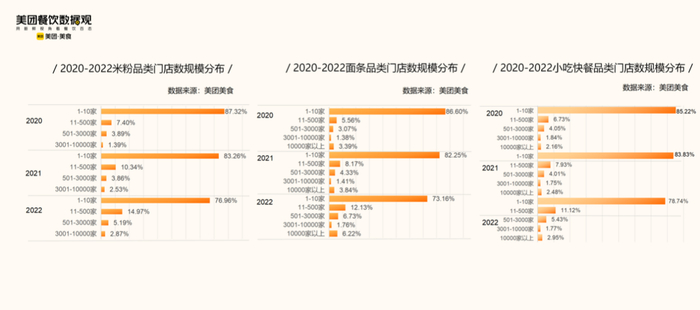 可以说子固路拌粉是伴随着整个米粉赛道的崛起而诞生的,2020年之前米粉一直处在一个“大而不强”的格局下,而2020年开始整个米粉赛道的连锁化率开始了明显提升,而反观小吃快餐赛道和面条赛道,这几年虽然面条赛道有资本的加持,却仍然走出了和米粉赛道背离的颓势
