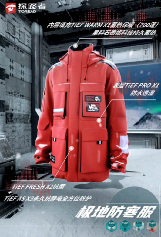 2022年探路者全新推出的极地防寒服3.0版也在本次为探险家们提供的服装装备之中。此款防寒服是在复刻版极地防寒服的基础上进行了升级迭代,在面料上使用了探路者自主研发的“极地仿生科技平台“中的TiEF WARM锁温科技、TiEF PRO防水透湿科技、TiEF AS抗静电科技和TiEF FRESH清新科技,众多设计细节上也进行了更新,在保证美观的同时,让穿着者无论户外探险还是日常穿着,都能感受到安全和舒适。