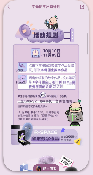 为了助力三星Z Flip新机能够源源不断地吸引站内外用户的关注,释放品牌势能,实现更大的营销可能性,小红书以旗下的数字空间R-SPACE为基础,依托「宝藏元宇宙」IP打造活动「字母团宝出道计划」,以数字作品的创新互动玩法,进行新机价值透传,帮助新机全面构建起“懂玩”、“会玩”、“潮流时尚”的形象调性,为新机上市期的价值目标做预热铺垫。