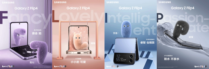 例如拥有幽紫秘境外观的(F)范儿FANCY,所对应的形象是开朗爱美的时髦精宝贝,但她同时也代表着三星Z Flip4新机的潮流外观属性;繁樱花园外观的(L)噜噜LOVELY,则代表的是惬意生活的可爱气息,凸显出Z Flip4新机的小巧与轻便;蓝海假日外观的(I)艾总INTELLIGENT,外表高冷,内在冷静睿智,所对应的是Z Flip4新机的精致与智能;最后则是哥特太空外观的(P)皮宝PASSIONATE,代表的是Z Flip4新机的IPX8级超强防水功能、能够为你的生活冒险提供勇敢助力。