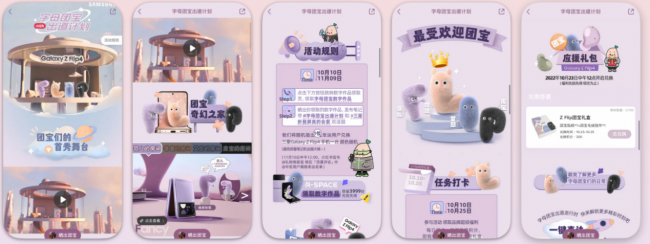 例如有低门槛强福利互动机制,能够强吸引用户参与活动的惊喜盒子,只要参与活动即可有几率获得定制的团宝形象贴纸礼盒,赢取生动可爱的Z Flip4团宝贴纸以及团宝毛绒挂饰。
