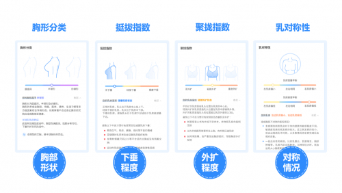 从测量数据和胸部健康出发,为用户推荐个性化的内衣尺码、内衣款式,并从习惯、运动、体态、饮食等4个方面给用户提供综合的胸部保养建议。让每一个中国女性都能更轻松的穿对内衣。