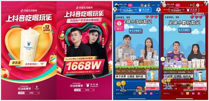 在「心动观赛季」活动期间,茶百道创新产品推出巧妙的融合世界杯热点。首先,通过“主题产品组合+短视频铺设+大场直播”的策略布局玩法,引爆品牌关注和产品销量转化;其次,主推“新品+应季热销单品”,以“CP”组合的方式,助力深夜观赛的消费者“为世界干一杯”。茶百道联动优质达人@我是小胖啊和@我是小沈阿组成双账号CP主播,创新达人直播间的玩法和内容,结合赛事足球元素进行直播间主题装饰,一举创造单日直播支付GMV超千万,主推品销售超千万,成为华西用户最爱囤TOP品牌。