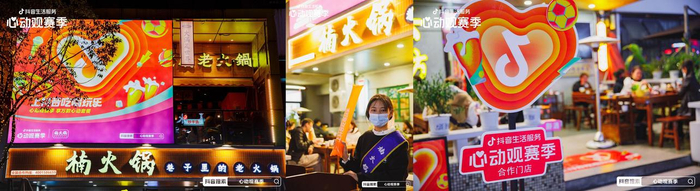 线下超强氛围铺设,营造心动场景体验。“心动观赛季”期间,华西地区在成都、重庆、昆明推出11家心动观赛合作门店,涵盖酒吧酒馆、烧烤小龙虾店、高空酒店,这些门店均已换上世界杯的皮肤,大荧幕、美食氛围感拉满。多位抖音达人共聚楠火锅、何师烧烤,共同举办世界杯主题趴,共度难忘的观赛之夜。
