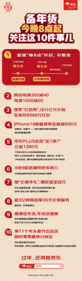 每满300减40、抢8888元红包、iPhone14至高减900,实惠年货在京东