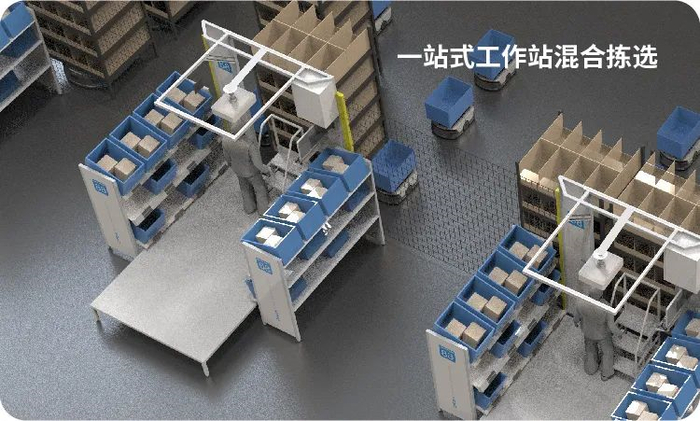 不同机器人共用同一拣选停靠点,让拣选员可在同一拣选点完成大中小件混合拣选,人效更高