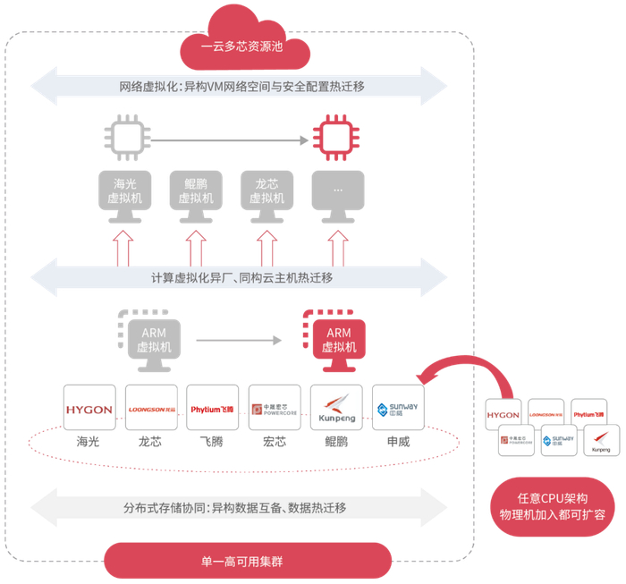 首先,在新一代私有云中,“一云多芯”架构是必然。作为国内最早一批的信创云实践者和一云多芯、异构融合技术路线的先驱者,与传统云平台以x86架构服务或单一国产架构IaaS服务能力模式不同,品高云实现了多种异构芯片基础设施在单一高可用资源池中无缝协同支撑业务,实现不同架构CPU的混合异构部署及集中统一管理与调度,满足业务对资源的不同需求。