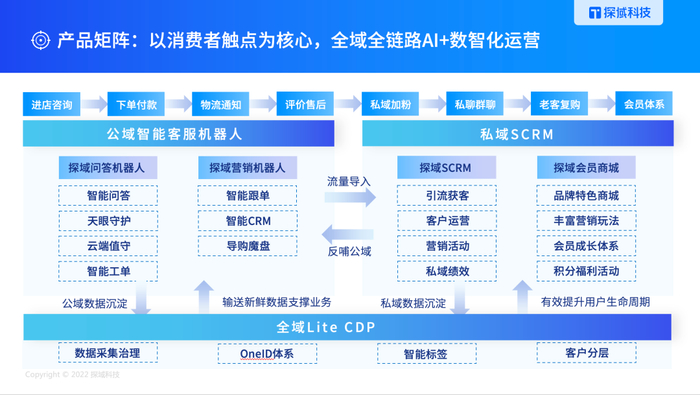 企业之间的竞争,不只是某个环节的竞争,而是整个价值链的竞争。从用户进店咨询、下单付款,到物流签收、售后服务;从用户从公域平台进入到私域企微,从内容种草到下单复购,在用户旅程的每一个节点都有挖掘增长的可能性。面对消费者需求和营销环境的不断变化,新的机会和挑战也会层出不穷,唯一不变的是品牌必须与时俱进,电商企业可以以数字化系统为抓手,不断积累和沉淀数据力、流量力、转化力、服务力和产品力。探域科技通过一套全域智能营销SaaS系统,助力电商企业在接下来的经济复苏期打造全方位数字化战斗力,实现全链路数智化升级: