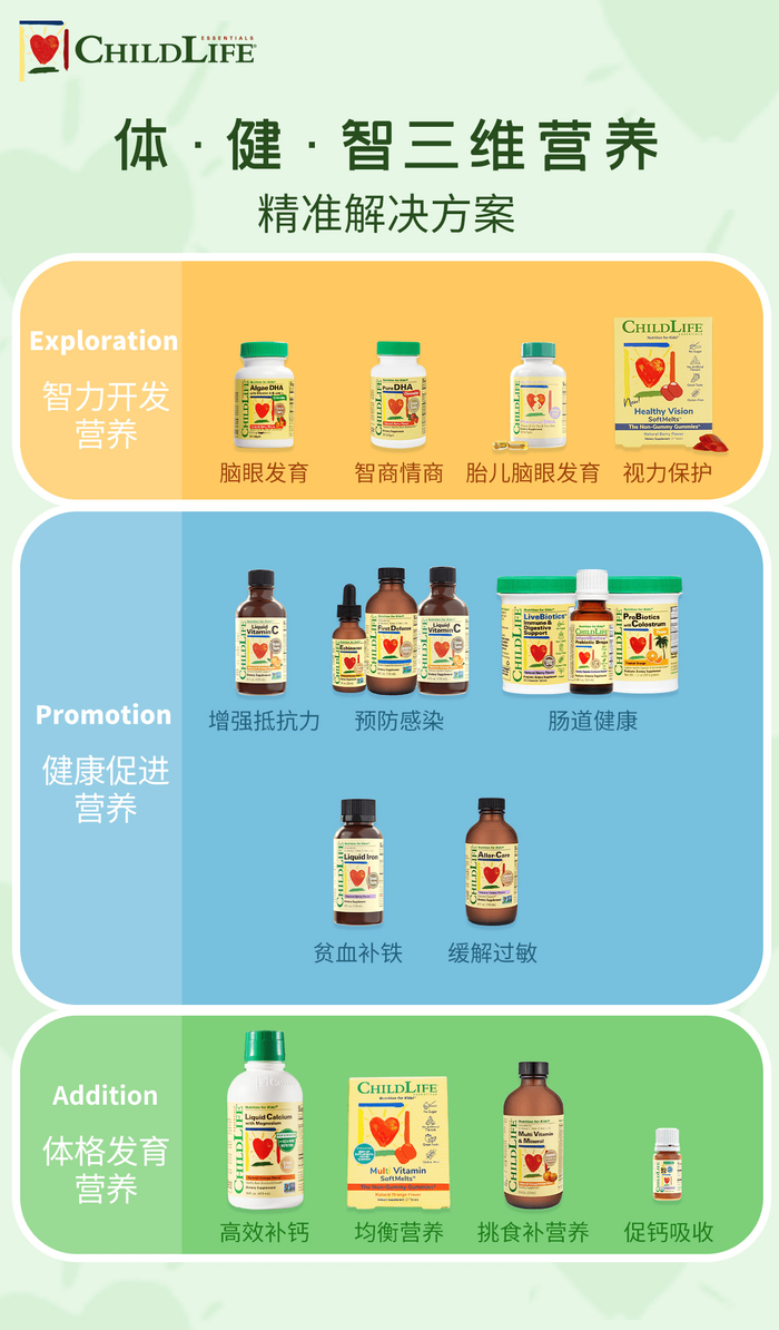 ChildLife体·健·智三维营养补充系统除了特殊时期父母都在关注的“健康促进营养”,还覆盖了“智力开发营养”,“体格发育营养”、以定制人群、场景、阶段的细分营养满足婴童营养补充的差异化诉求,父母可以根据需求对应选择适合自家孩子的产品。