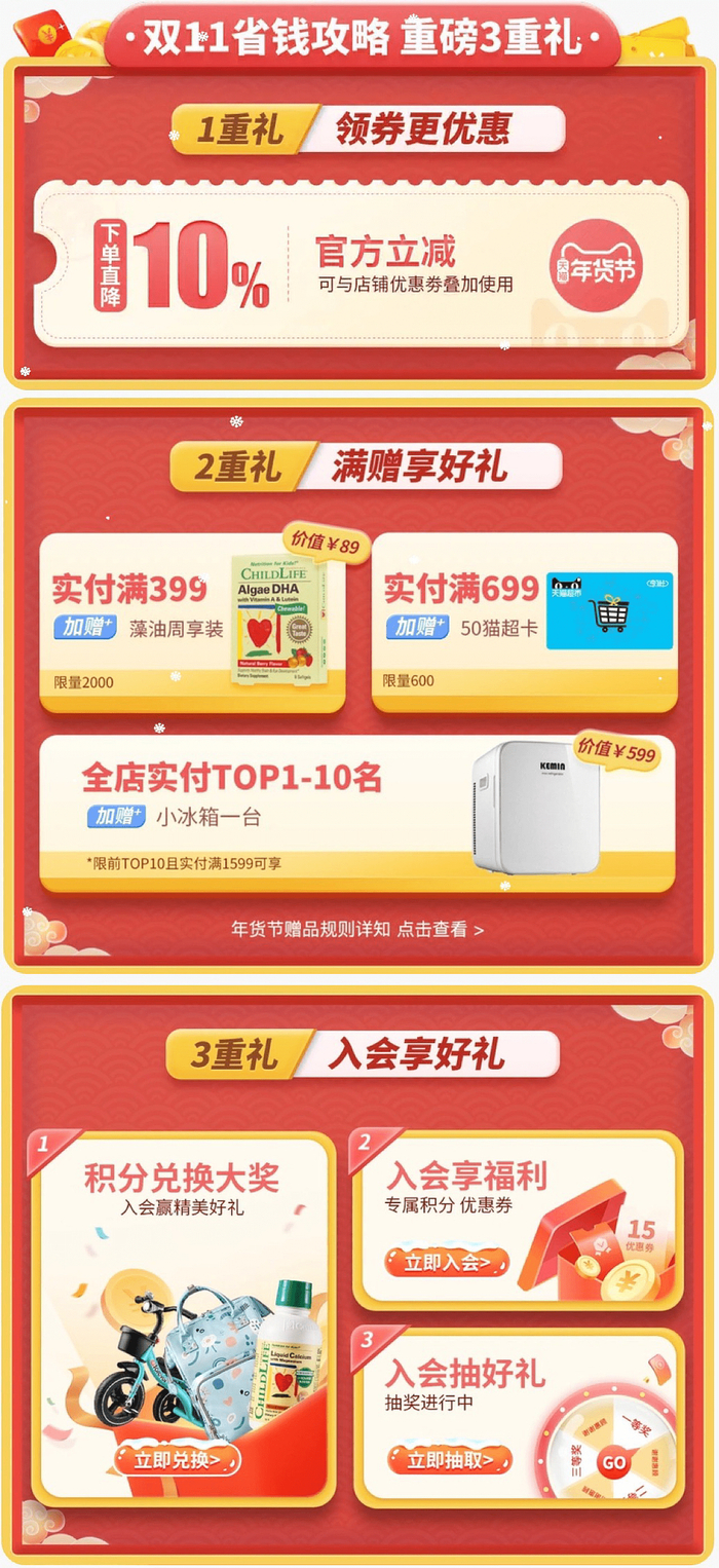 天猫平台ChildLife海外旗舰店,同样推出了重磅3重礼。一重礼,官方立减,下单直降10%,可与店铺优惠券叠加使用。二重礼,满赠享好礼,实付满399加赠价值69元的藻油周享装;实付满699,加赠50元猫卡;全店实付满1599,TOP前10的用户加赠价值599元的小冰箱一台,数量有限先到先得。三重礼,入会的家长们还可享受会员专享礼遇。