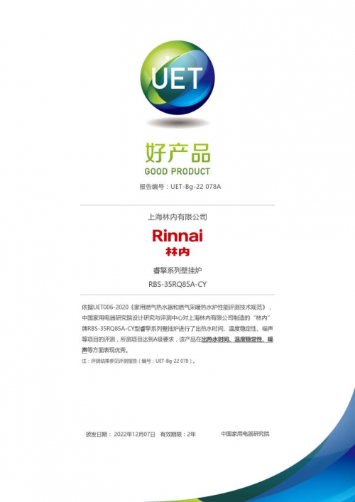 2022年12月23日,“2022中国家电行业年度峰会暨‘好产品’发布盛典”在线上召开。林内新推出的睿擎系列壁挂炉凭借优秀的出热水时间、温度稳定性及噪音控制,拿下了本次“好产品”称号,为百年林内再增一道光彩。