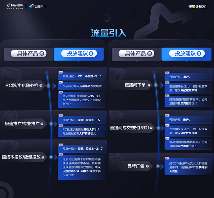 在制订好预算后,接下来需要将预算分配到不同投放产品中,释放出产品组合更大的助推势能。我们为不同直播间梳理了巨量千川的优质产品组合玩法: