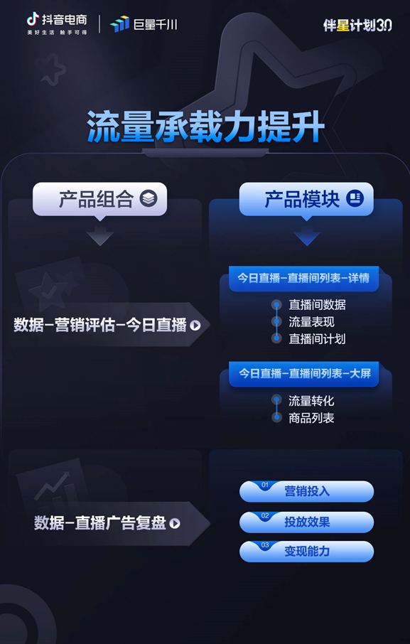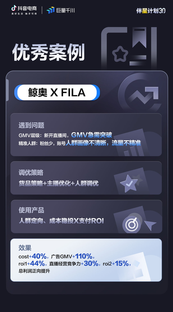 截至目前,「伴星计划3.0」冷启动、付费价值优化、投多赚多、大促四大场景解决方案已全部披露,为服务商提供了关键场景下与之适配的投放法则。在「伴星计划」外,巨量千川也会持续推出更多针对抖音电商服务商的扶持活动,普及产品组合策略、服务商1V1诊断、素材指导等扶持方式,为更广泛品类的服务商带来生意增长机会。