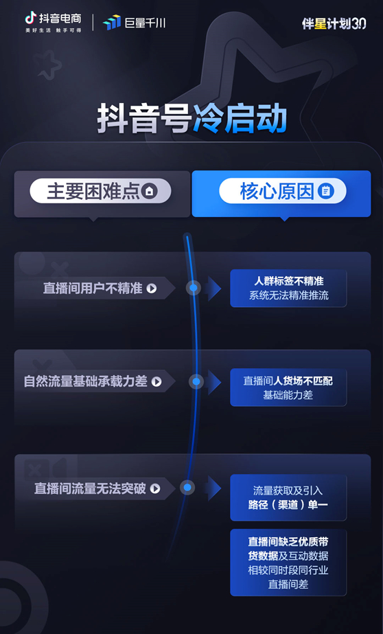 「伴星计划3.0」是巨量千川协助品牌服务商长效经营的扶持计划,旨在从付费价值优化、投多赚多、大促、冷启动这四大场景入手,通过针对性扶持政策帮助服务商直播生意节节攀升。针对以上冷启动场景,「伴星计划3.0」将从核心打法逻辑与产品组合应用入手,为服务商提供获取精准人群、提升流量承载力、降低素材制作门槛、加快流量引入的“标准答案”。