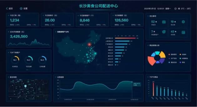 蔬东坡“生鲜大脑”,能够将生鲜配送企业内部运营数据进行链接,基于大数据的分析和整合,对企业进行全流程的即时分析、指挥、调动、管理,通过“数据大屏”,实现企业内部运营数据可视化。