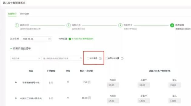 批量核价板块,系统将客户下单的商品用列表集中呈现出来,方便快速修改对应商品的价格,并且可以根据客户的类型进行批量修改。
