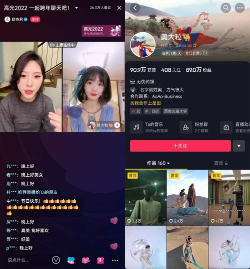 连麦过程中,抖音舞蹈主播@奥大粒 分享了自己过去一年丝绸之路户外直播的体验。她因在抖音直播跳敦煌舞、传播敦煌文化被网友熟知。2022年,@奥大粒 始终奔波在丝绸之路的轨迹上,她的户外舞蹈直播最高同时在线人数曾达到7万。她说,网友们在直播间看到的@奥大粒,已经是梳妆完毕准备跳舞的“仙女”模样,实际的直播经历则是困难重重。她形容自己是“女版唐僧”,在户外直播时,暴雨、风沙等意外天气都是意想不到的挑战。但粉丝的支持是她直播下去的动力。未来,@奥大粒 还计划挑战海上丝绸之路直播,敦煌、河西走廊直播也将在天暖时继续。