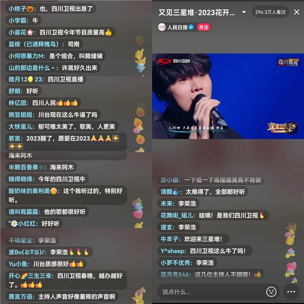 同时,人民日报抖音、微博、客户端、B站等,四川卫视抖音、快手、微博、视频号、B站等,四川观察抖音、快手、微博、视频号、B站、百家号、搜狐号、咪咕号等,全网总计超30+账号,都对节目进行了直播,直播观看量超1300万,网友纷纷表示,“四川卫视今年太6了”“舞美音效唱功都很棒!”“好听!好看!好棒!”“文化输出这一块你们真的很会”“文博联动的演唱会也太酷了吧!”“文博联动狠狠拿捏了我”“特效值真的拉满了”…