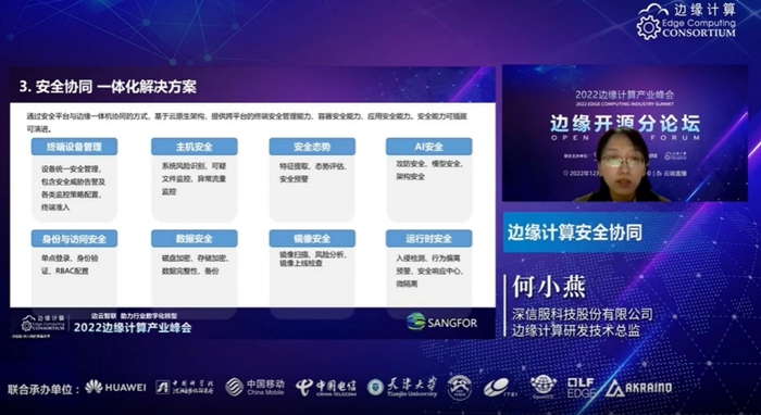 12月28日,由中国边缘计算产业联盟主办的“边云智联 助力行业数字化转型”2022边缘计算产业峰会通过线上直播方式举办,深信服边缘计算研发技术总监何小燕受邀出席峰会,并在边缘开源分论坛进行了《边缘计算安全协同》的主题分享,介绍了边缘计算场景下安全面临的挑战,以及深信服在边缘计算场景的实践经验。