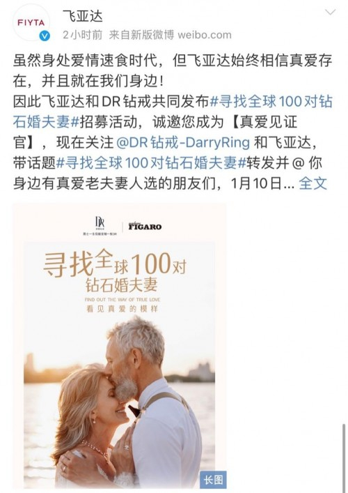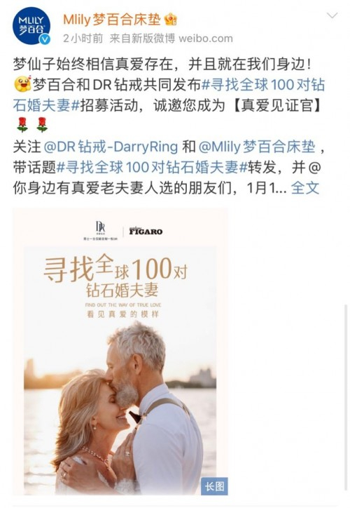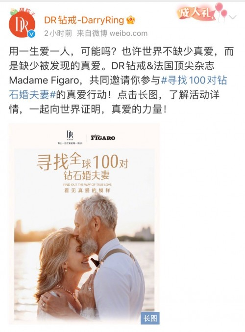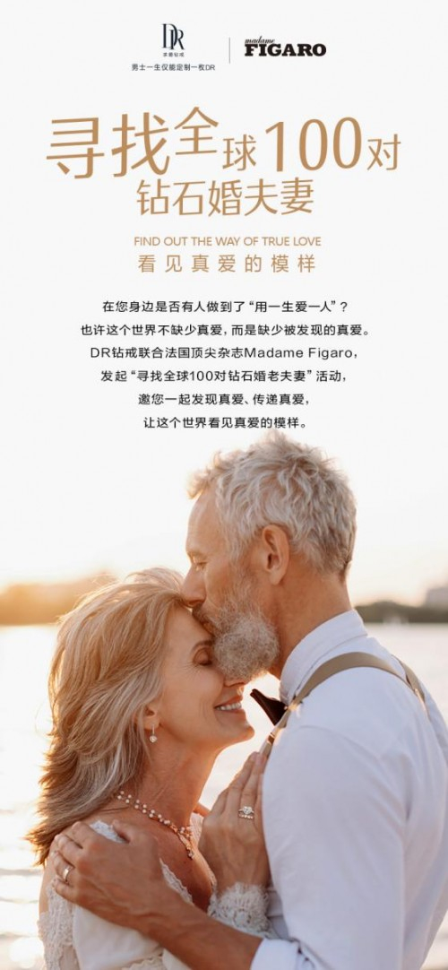 DR钻戒官宣联合法国顶尖时尚杂志《MadameFigaro》发起【寻找全球100对钻石婚夫妻】真爱行动为钻石婚老人的真爱故事加冕,希望通过钻石婚老人们用一生爱一人的故事,让更多人看见真爱的模样,找回爱情的初心。