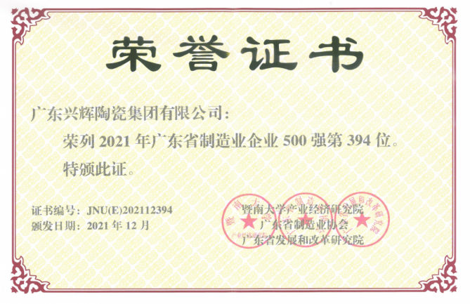 荣列2021年广东省制造业企业500强第394位