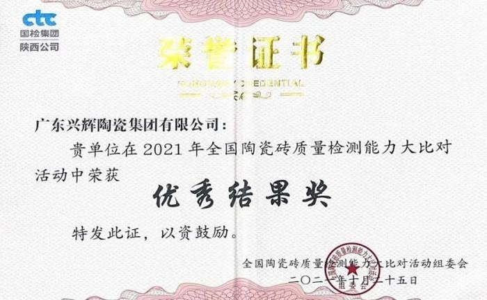 兴辉瓷砖获“质量检测优秀结果奖”证书