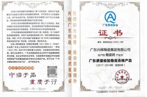 兴辉瓷砖获“质量检验稳定合格产品”证书