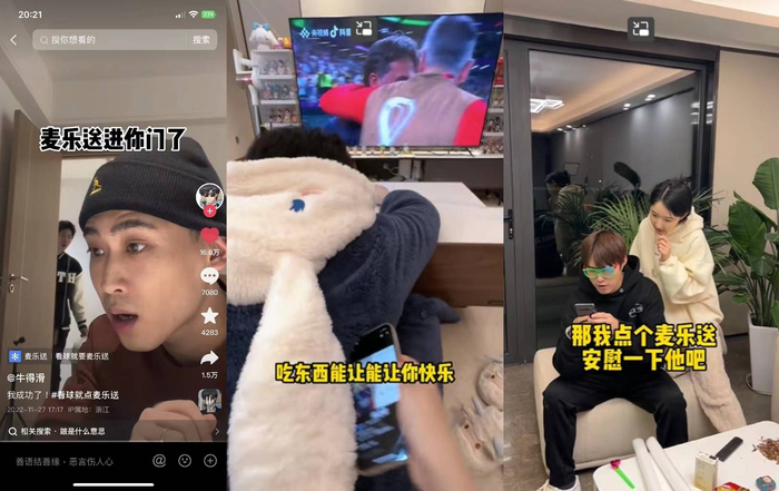 比如百万粉丝达人@牛得华 另辟蹊径,延续其幽默搞笑的风格,用“蓝色馒头”的噱头引入,融入自己做饭失败后还是靠外卖的经历,过程中强化“麦乐送进门了”的体验,让麦当劳麦乐送成为网友的关注点和讨论内容,该条短视频成功突破了480万的播放。而在@周坤坤 的短视频内容中,面对喜爱的球队被淘汰时,麦乐送餐品又成为了球迷遗憾场景下的情绪“味蕾安慰剂”。