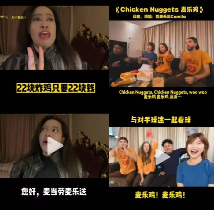 除了单向种草,结合世界杯期间球迷爱参与竞猜等互动活动的行为洞察,品牌还就达人内容合作中发起了点麦乐送-绕口令活动。 比如达人@拉美天后Camila以Rap歌曲的方式,朗朗上口的押韵旋律巧妙融合了麦当劳麦乐送绕口令活动;达人@妮娜Nina则以讲故事的方式,把“口令”和“咒语”进结合,通过念咒语和麦乐送马上到家的场景实现,进一步强调观赛期间的“麦乐送”活动,点单互动的趣味玩法,自带传播特质,通过短视频这一内容媒介,能够很大程度的激发消费者的参与行为。