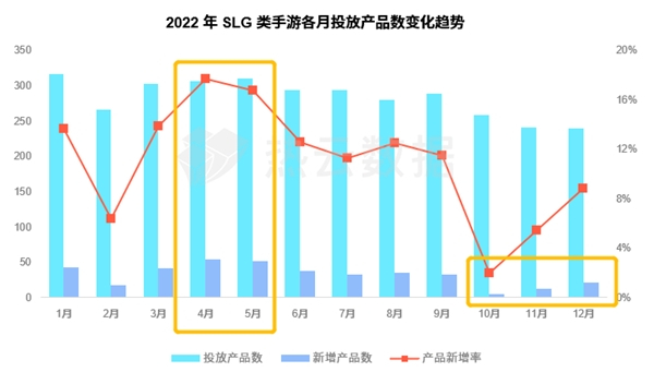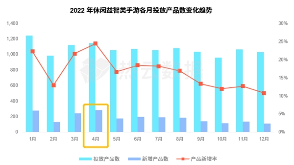 角色扮演类游戏 4 月投放产品数最多,春节前夕为新品买量高峰;SLG类4、5 月投放总量及新增率表现突出,Q4 买量新品数大幅下滑; 休闲益智类游戏,月度投放产品数较为均衡,4月新游投放数量最多。