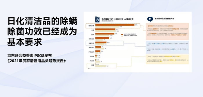 同时,京东联合益普索IPSOS发布《2021年度家清蓝海品类趋势报告》则显示,洗衣凝珠产品中除螨除菌的卖点分布占34%,用户需求分布占20%,均排在第一位;在零点研究咨询集团发布的《床品除螨市场调研白皮书》中也显示,除螨除菌服务是用户最重视的售后服务之一。