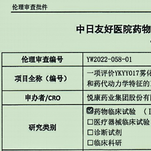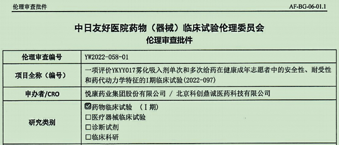YKYY017雾化吸入剂自2022年11月30日获批临床至今,不到一月时间,北京科创鼎诚医药科技有限公司完成了I期临床的方案研讨会、研究中心及PI的选定与确认,于12月21日通过中日友好医院伦理审查,即将进入Ⅰ期临床试验阶段。