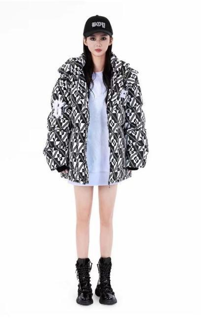 想要更休闲一点的,则可以选择拼接短款羽绒服,配合衣服上的建筑暗纹,加上同色系的运动裤、运动鞋,远看是冬日里大大咧咧的运动女孩,近看也不失丰富细腻的朋克风格展现。