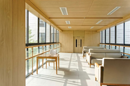 顺应城市核心区老年人对阳光的追求,养老版块沿用回廊式布局,减小了所有房间的进深,让每一个空间与走廊都充分与阳光、大自然相结合,“回字形”流线也非常适合轮椅老人在室内散步和徘徊,同时有效增加项目自然通风采光。