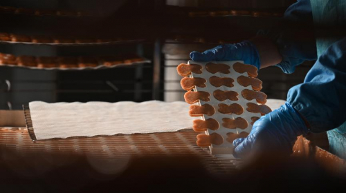 在原料验收、清洗、切片、挑选、烘干、分拣上,通过标准化提升工艺水平——从采购到清洗环节,中间3道工序筛选、剔除坏果;再蒸熟,用原果打磨成浆,添加赤藓糖醇这样的天然代糖;之后注入模型,高温烘烤24小时,再低温烘烤5天,整个工艺过程中对水分、微生物指标严格控制。