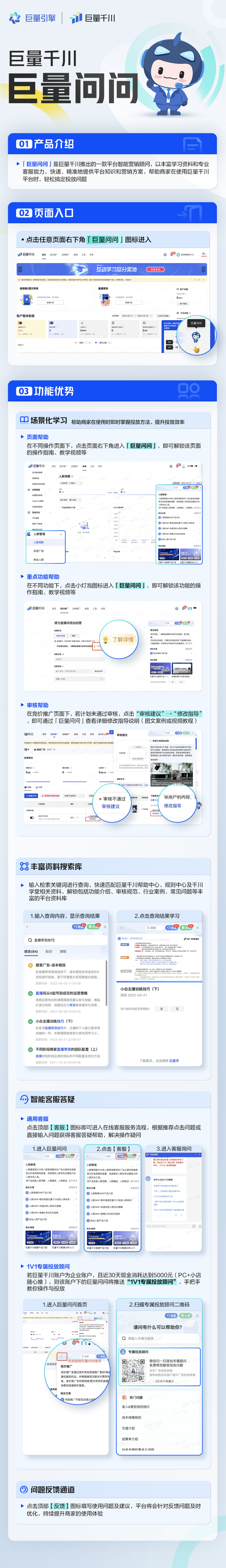 「巨量问问」将陪伴用户使用平台,以丰富学习资料和专业客服能力,快速、精准地提供平台知识和营销方案,帮助用户玩转巨量千川。