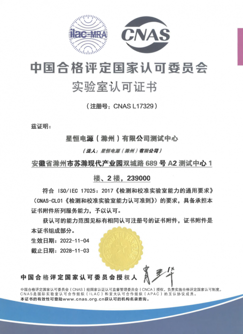 11月4日,星恒滁州制造基地测试中心获得来自中国合格评定国家认可委员会(CNAS)颁发的正式认可证书,标志着该检测中心的硬件设施、质量管理以及检测能力均得到国家认可,已具备开展实验室检测的技术能力和管理能力,出具的检测报告和结果,不仅在国内具有权威性,而且在国际上还能获得与CNAS签署互认协议的国家和组织的互认。
