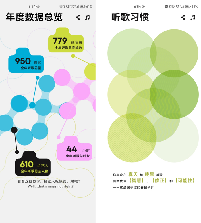 如果把流媒体平台看作一个音乐生物体,那每个用户的听歌故事就是这个生物体的音乐DNA。华为音乐从生物艺术中汲取灵感,将DNA结构作为设计载体,呈现了用户的年度首播歌曲、最晚听歌记录、单日最高播放等音乐足迹,并加入了四季音乐色彩元素,根据用户一年四季不同的听歌习惯匹配独有的设计,勾起春、夏、秋、冬不同时刻的音乐回忆。